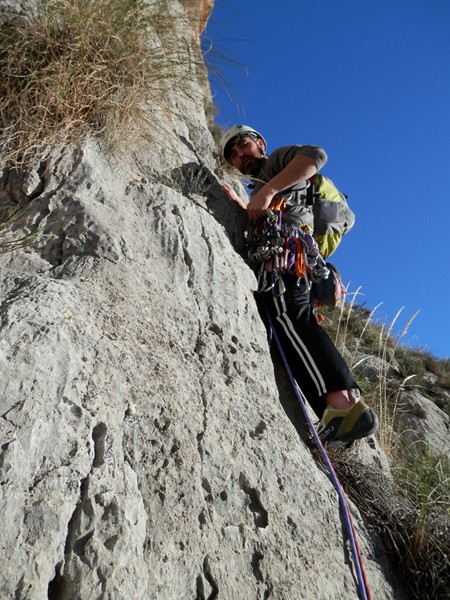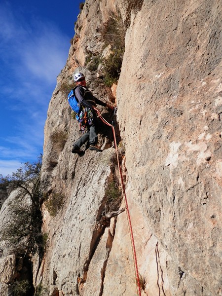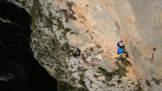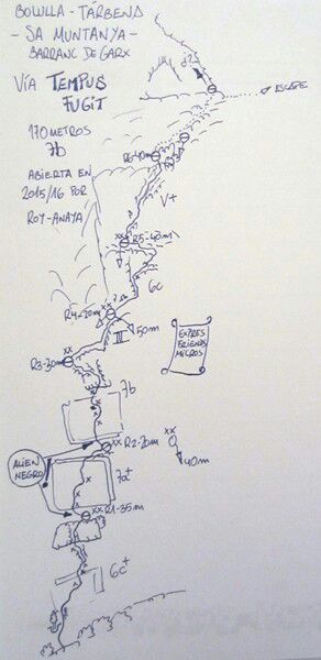 Al final de la coletilla de inicio he añadido TEMPUS FUGIT. Por varias razones. Esa máxima clásica es una constante en nuestras vidas, el tiempo vuela, pasa rápido como el rayo, es una invitación al carpe diem, a gozar de los placeres de la vida. Y ese es el nombre que decidimos darle a la vía que abrimos Roy y un servidor el año pasado en el barranco de Garx, Bolulla, y que ayer repetimos por partida doble, Roy con Álvaro y Mercuri conmigo. Otro día explicaré más a fondo las connotaciones del nombre y la relación con nosotros y nuestras vidas. La vía recorre la primera parte del gran Tossal del Niu, escala su contrafuerte inferior. Es la primera vía de una pared impresionante, lástima que la calidad de la piedra no sea de división de honor. En breve intentaremos llevarla hasta arriba, la publicaremos cuando llegue el día. Lo abierto son 6 largos, 6c, 7a, 7b, III, 6b+ y 6a+, con equipamiento donde no hay posibilidad de autoproteger. Si alguien quisiera repetir lo ayer estrenado que se ponga en contacto con Roy o conmigo.