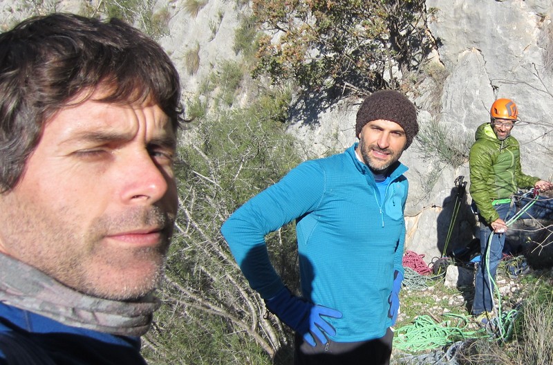 La “famosa” cordada de los hombres blandengues, Roy tras las ramas, Javi “Mercuri” y el que escribe tirando el selfie
